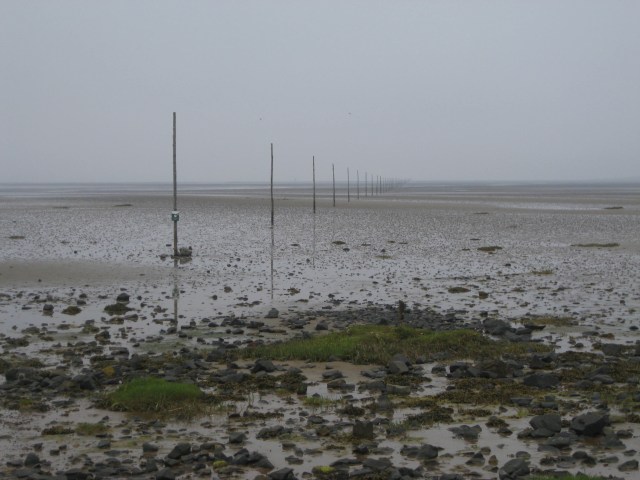 This is one of the rescue houses on the pilgrim’s route, if you get caught in the incoming tide, climb in and wait it out. The poles mark the route.