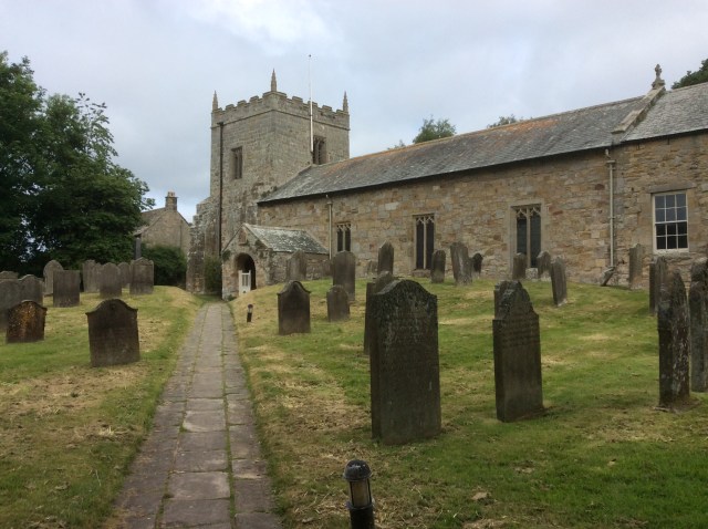 Walked passed St. Bartholomew’s Church in Kirkwhelpington that was built in the 13th century; we met the woman who lives next door – her house was even older. She told us that outside the small church in the next village was a box with snacks and water for walkers. Yeah – the box had a bag of trail mix, we left a £3 donation.