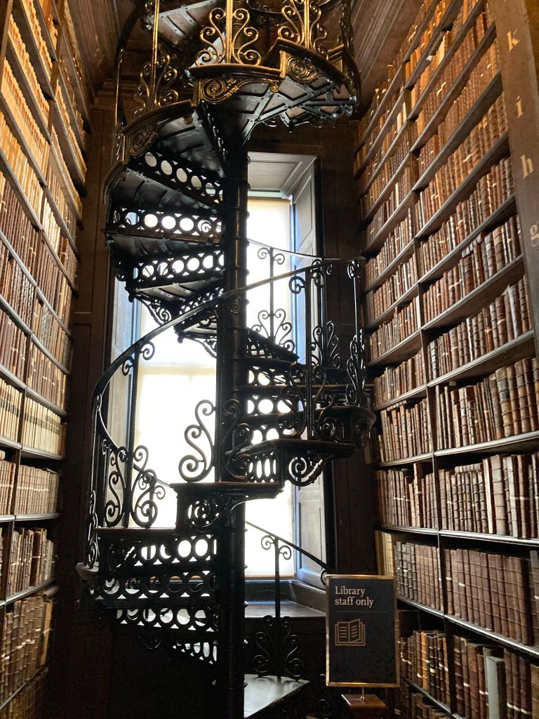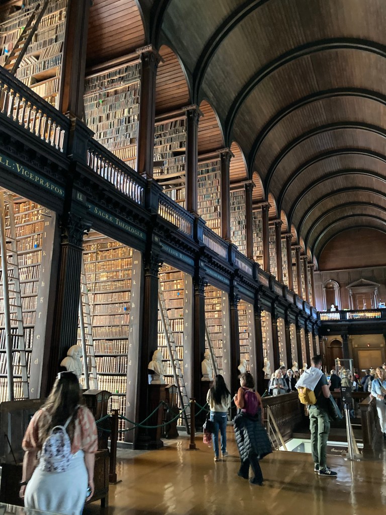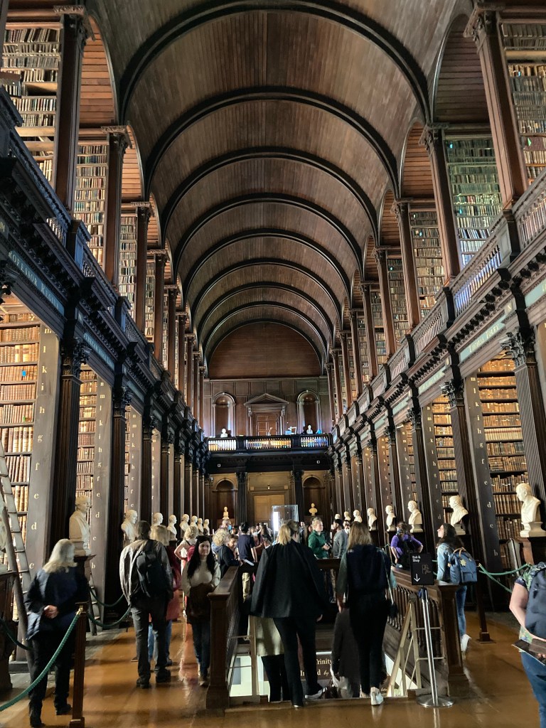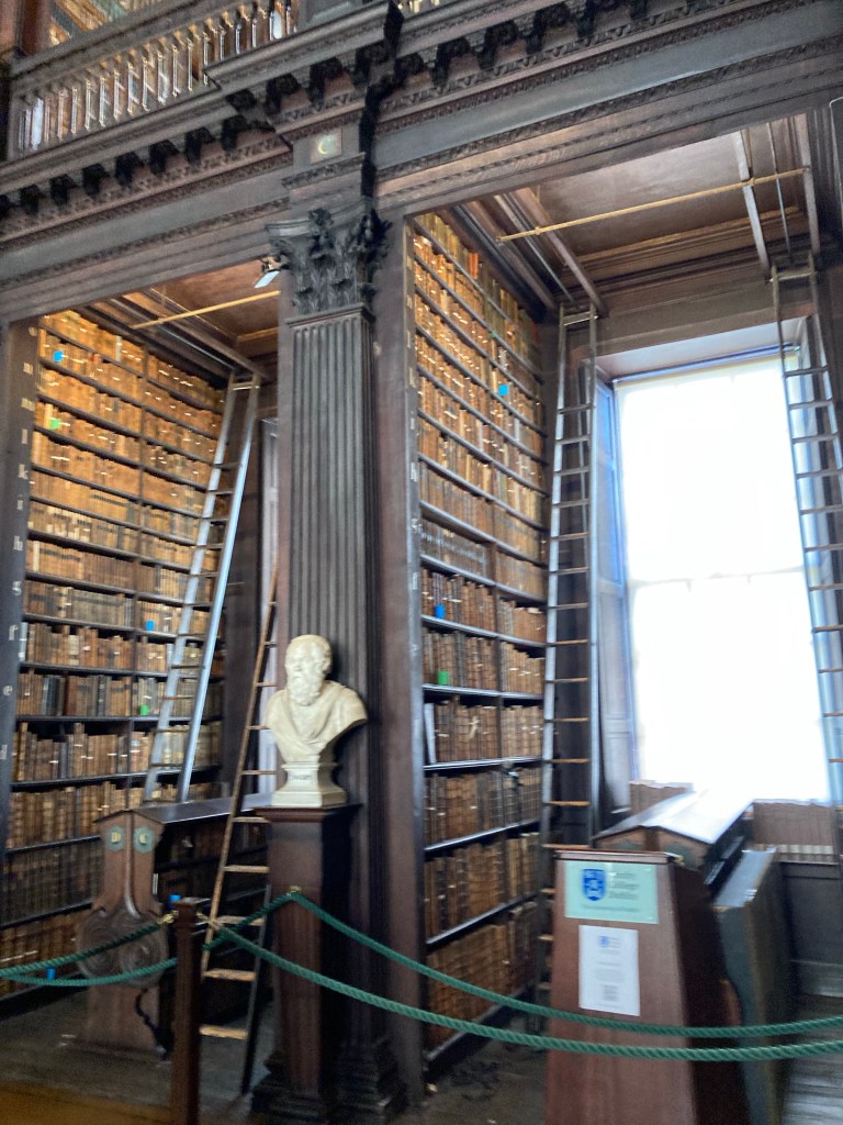 Only 7.5 miles today. After breakfast, we headed over to Trinity College, we had 10:30 am tickets to see the Book of Kells, a 1,200 year old manuscript, and the Long Room, the Old Library from 1732 stacked to the ceiling with 200,000 books.