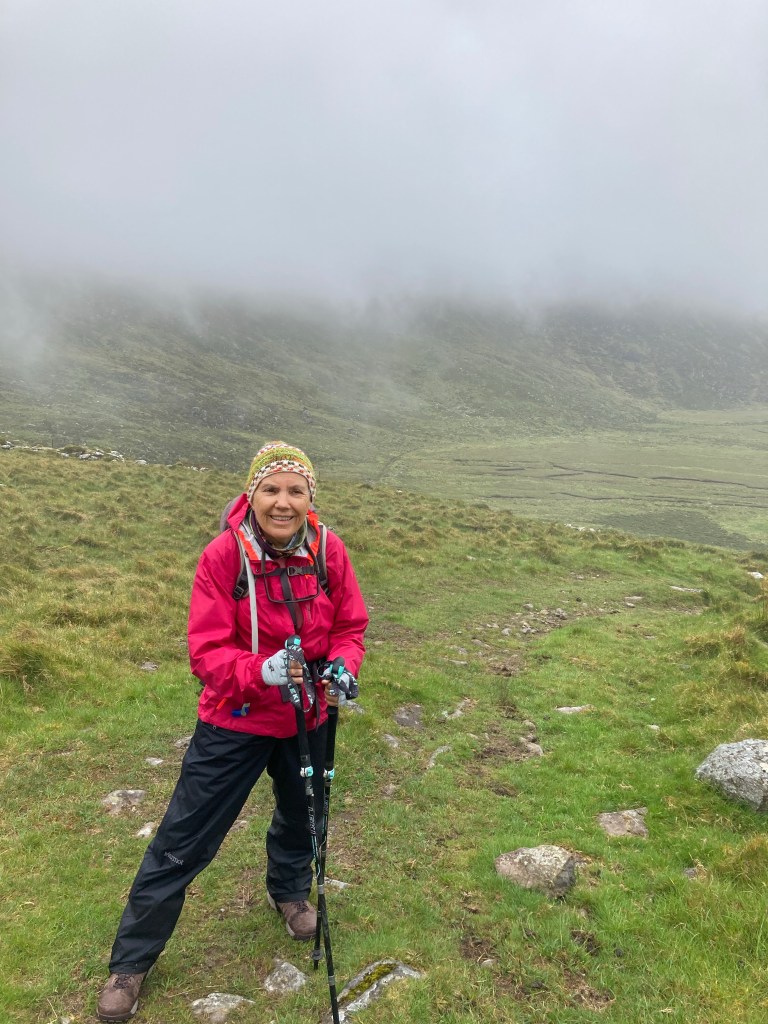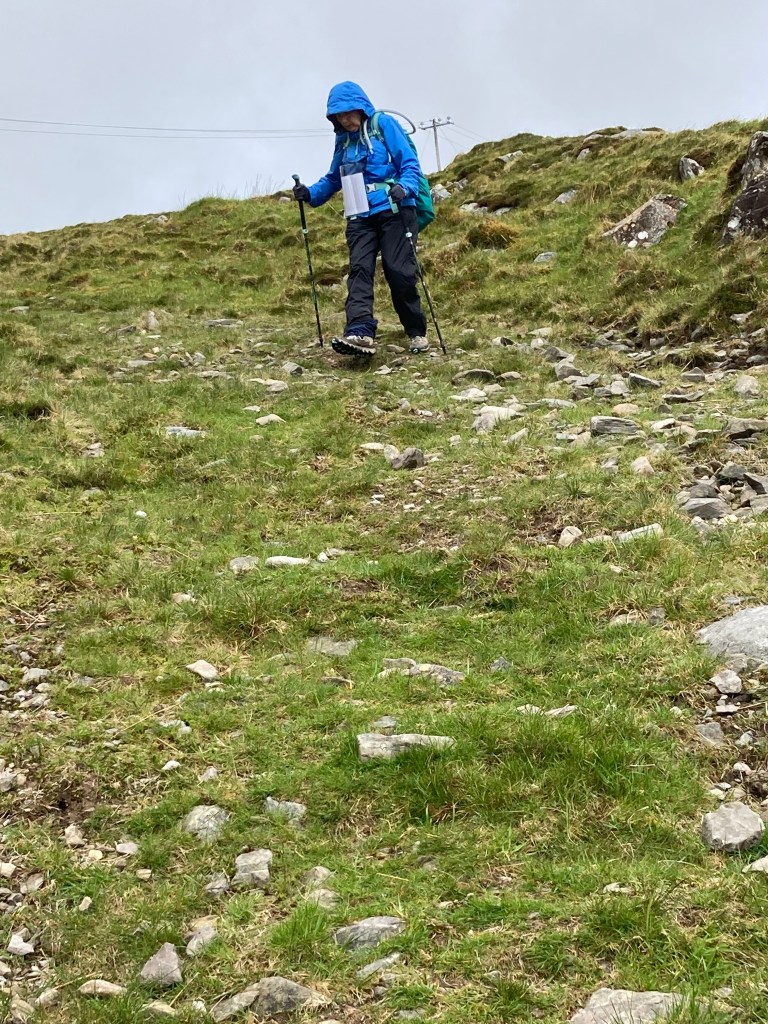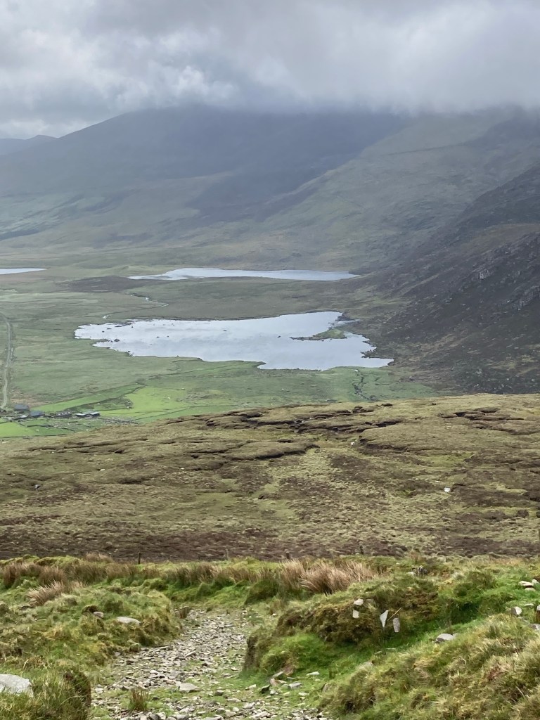 Took the 7 mile route, uphill climb through a pass, downhill through a glacier created valley and by lakes left behind by the glacier. Long climb up and extremely windy on the top. The clouds were low and flying by.