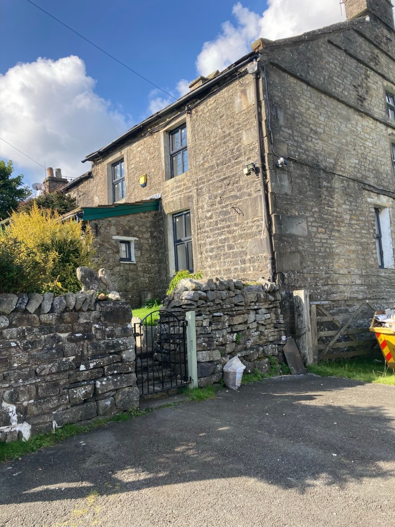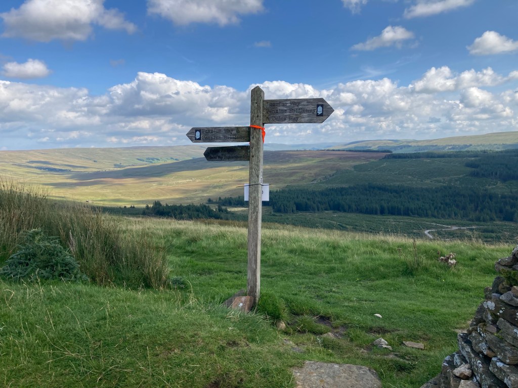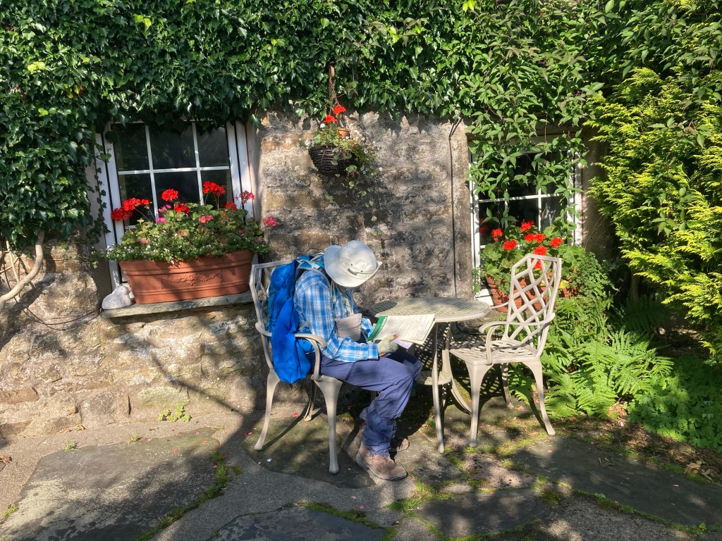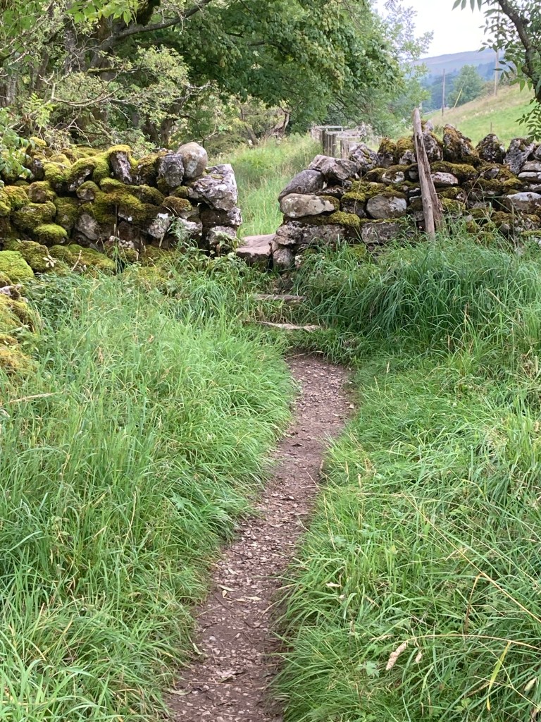 Scrambled eggs on toast, granola, and apricots, coffee and teaLeaving Hubberholme Farmhouse from “All Creatures Great and Small ”Bridge to farmhouse from “All Creatures Great and Small”Before bog landStone circleTrail markersStream crossingSheep on the trail Working phone booth Trail still good Still good section of the trailEntering the bogBoggy for what seemed like miles and miles, slow goingDry ish sectionStill on the right pathLeft the bog for a long up hill sectionAt the top of the fell (hill) and joined the Pennine Way TrailCairn marking the Pennine Trail junction Following old Roman roadLong downhill Good sign – the Dales Way signage Our stopping point, a happy sight Shepherd’s Cottage A welcome siteReading directions to get into Shepherd’s Cottage, Kate, the owner, at work. Dinner table Dinner – veggie lasagna, salad and wine, fabulous dinner. Kate, our host is great