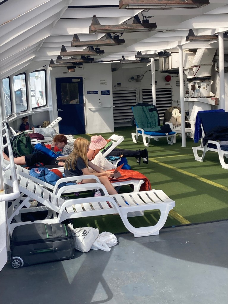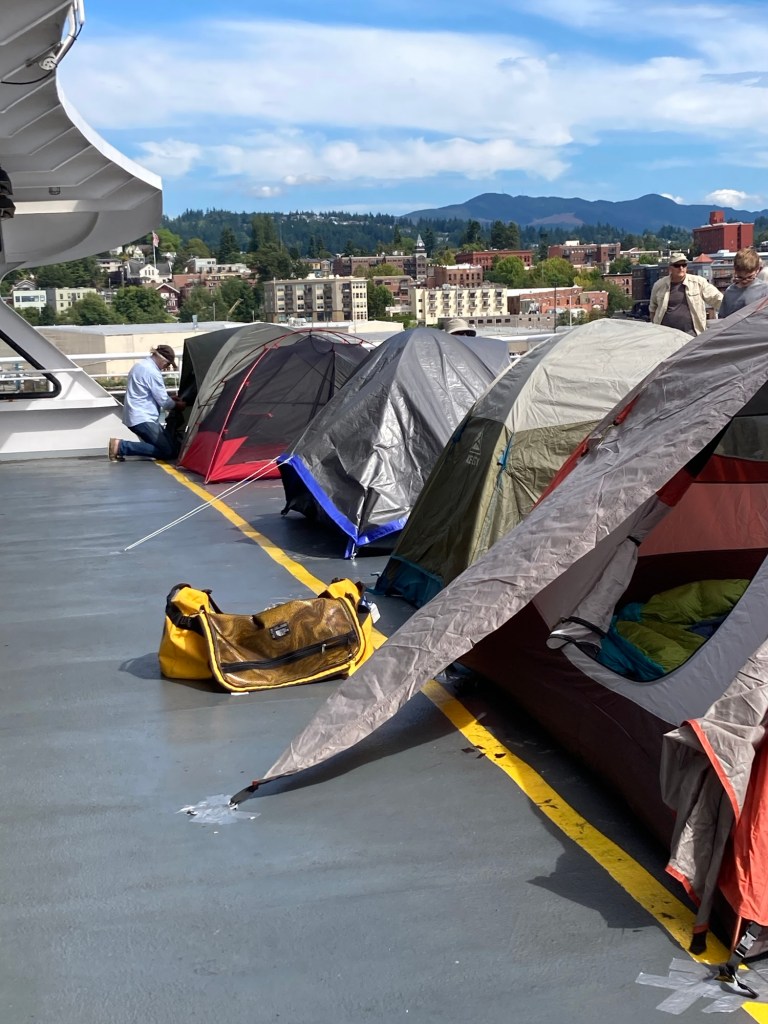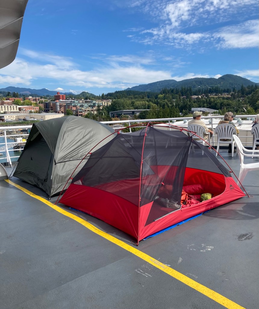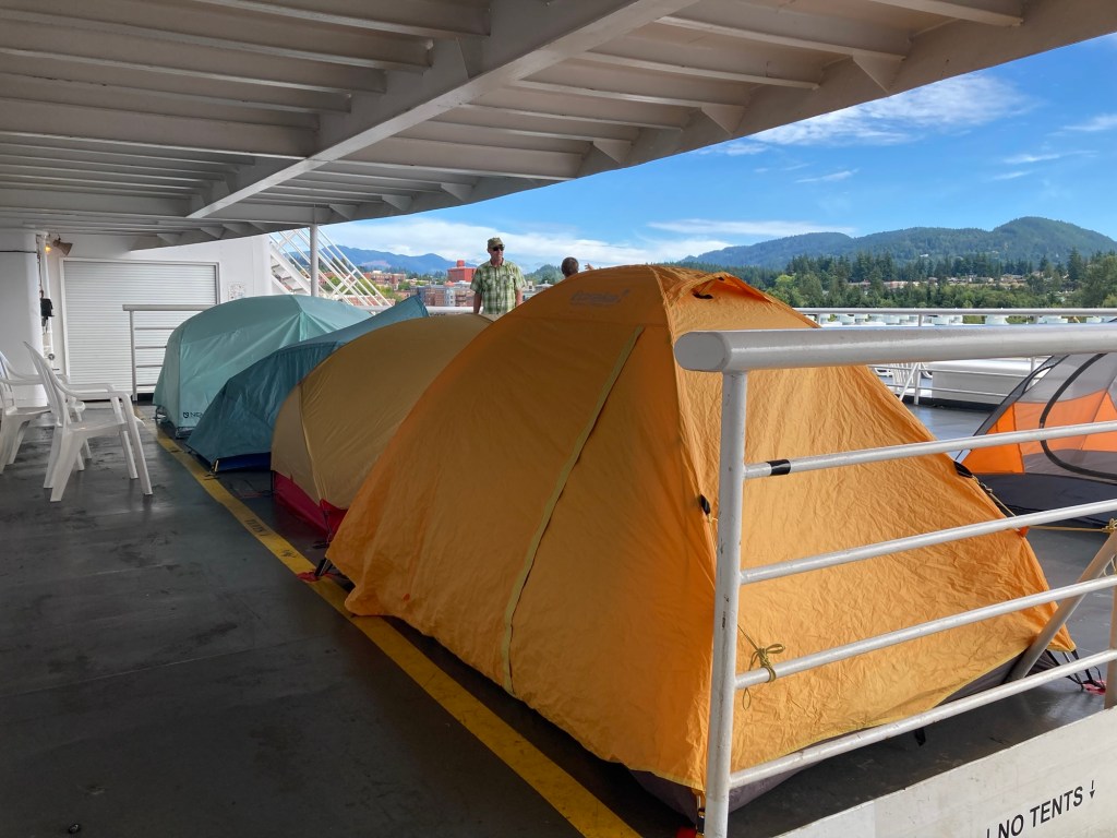 Then there are the travelers pitching tents on the deck, lots of duck tape to securely fasten tent to the deck